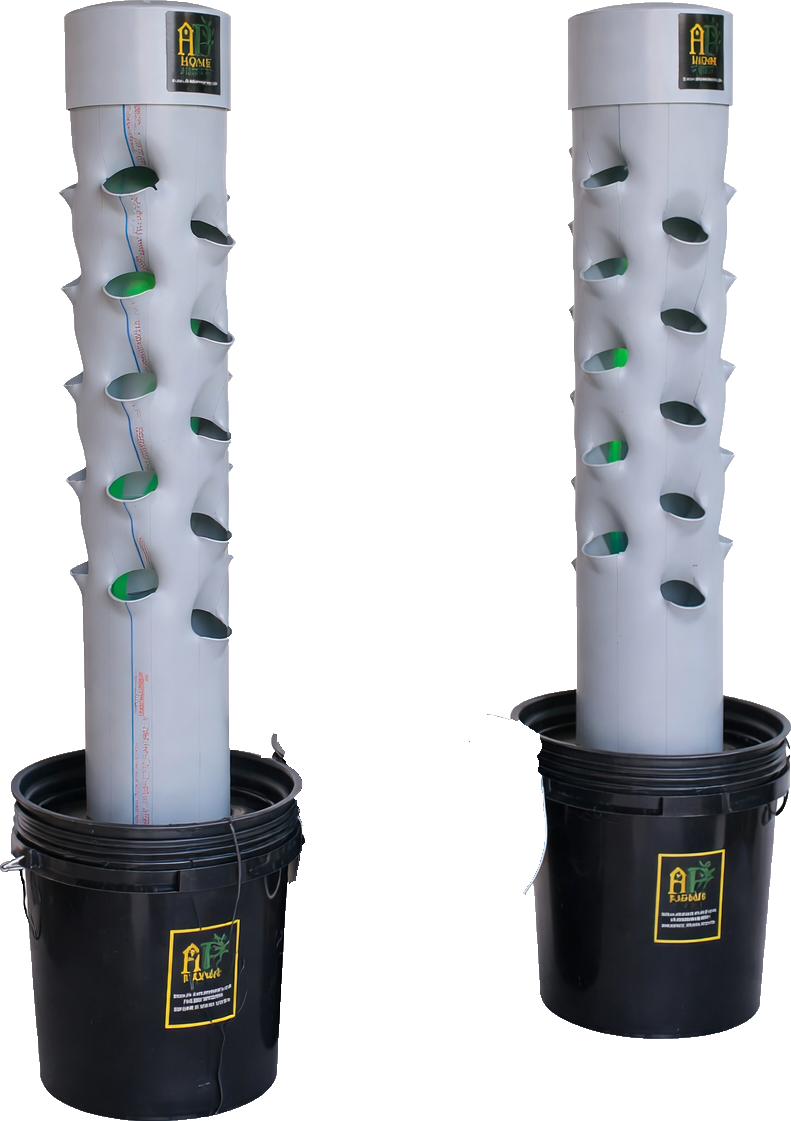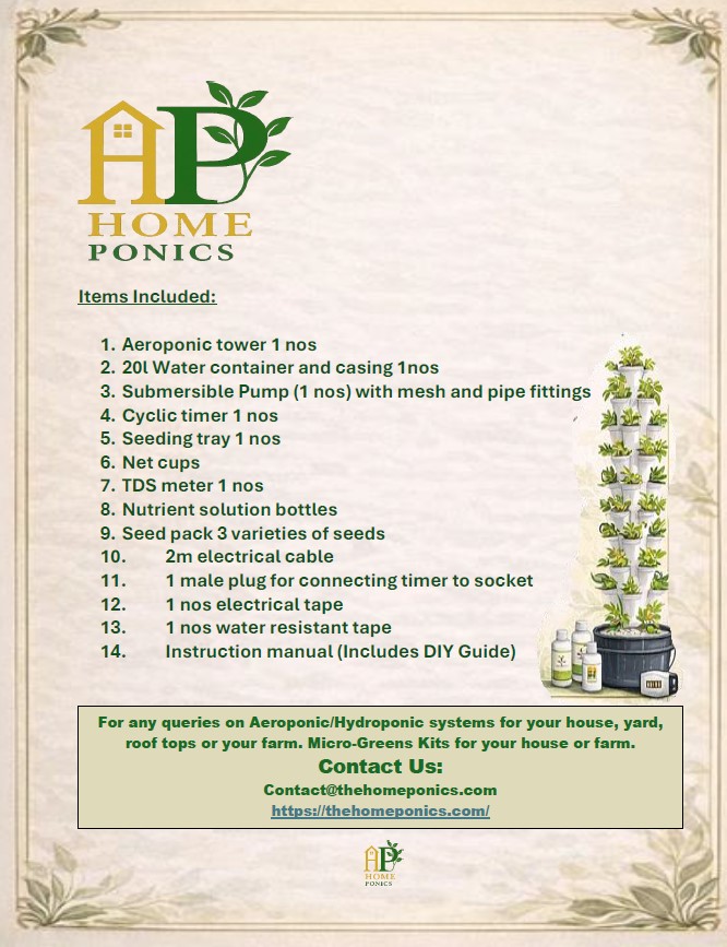 Product Includes: Tower, Bucket, Motor, Timer, Cups, Nutrient solution, DIY guide.