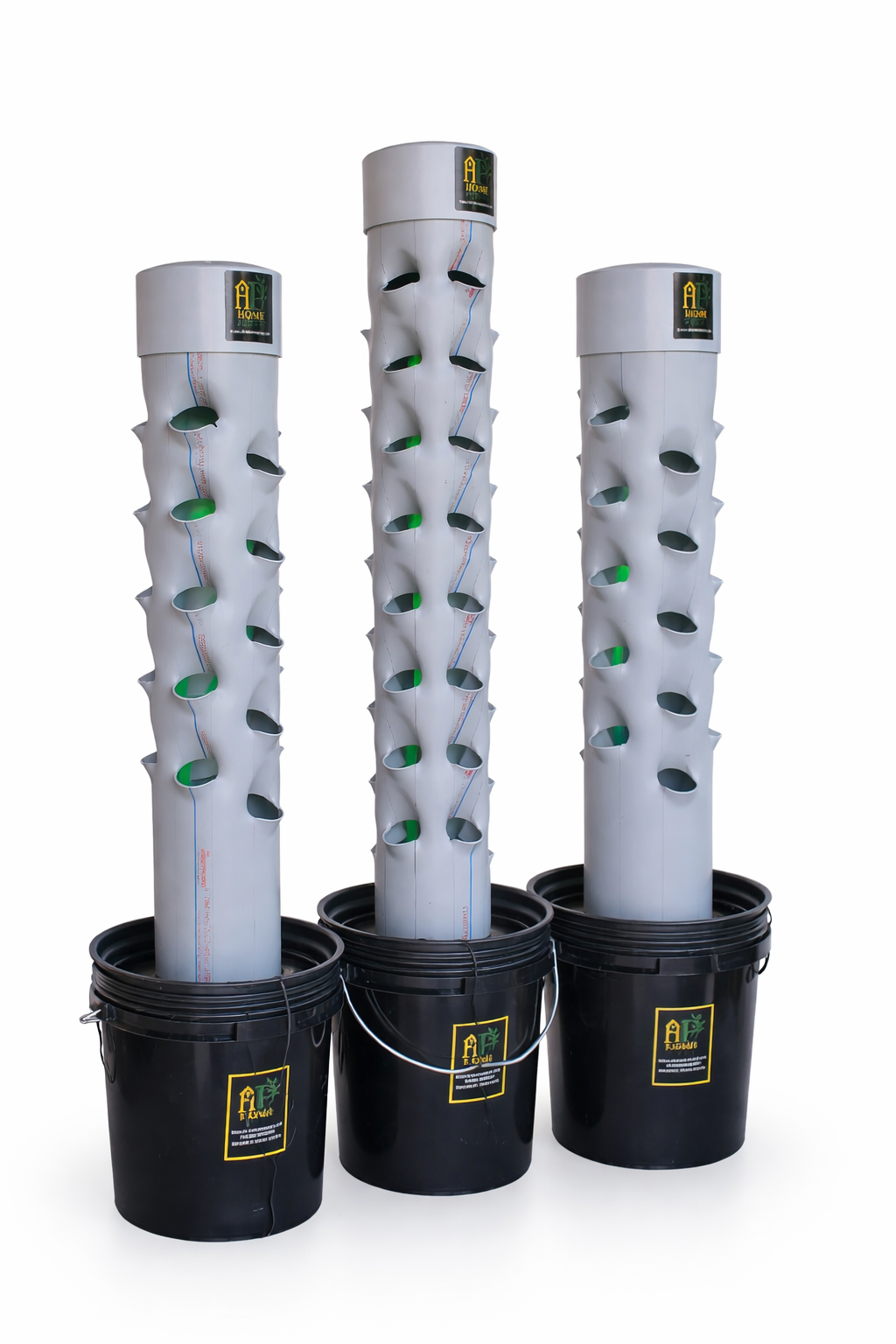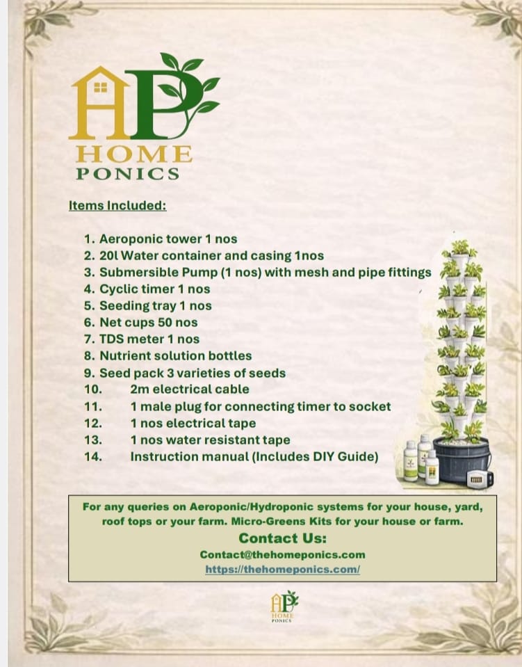 Product Includes: Tower, Bucket, Motor, Timer, Cups, Nutrient solution, DIY guide.